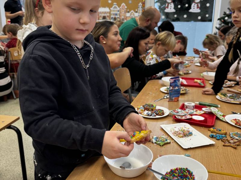 Dzieci wraz ze swoimi najbliższymi z ogromnym zaangażowaniem ozdabiały pierniczki kolorowymi lukrami, posypkami i smakowitymi dodatkami. W salach panowała atmosfera radości, kreatywności i… odrobina słodkiego bałaganu!